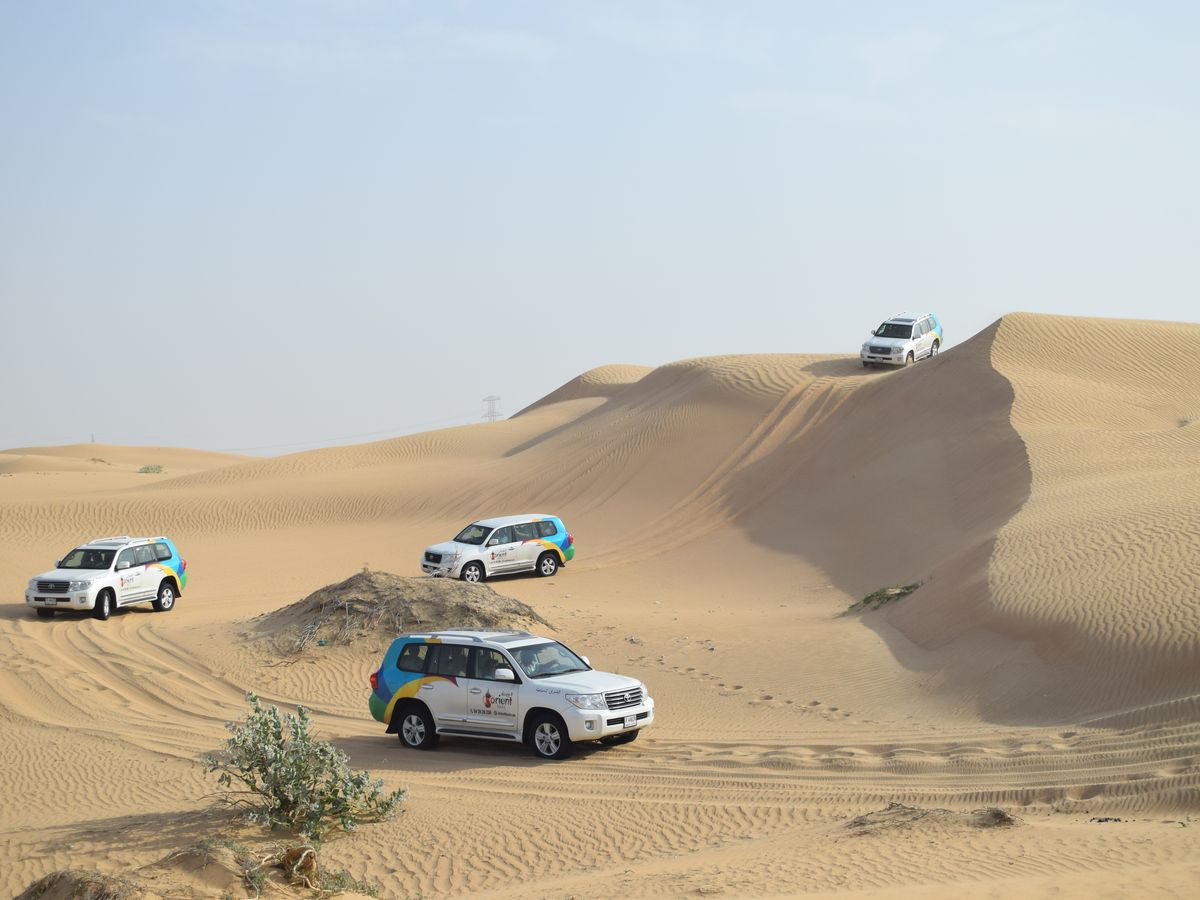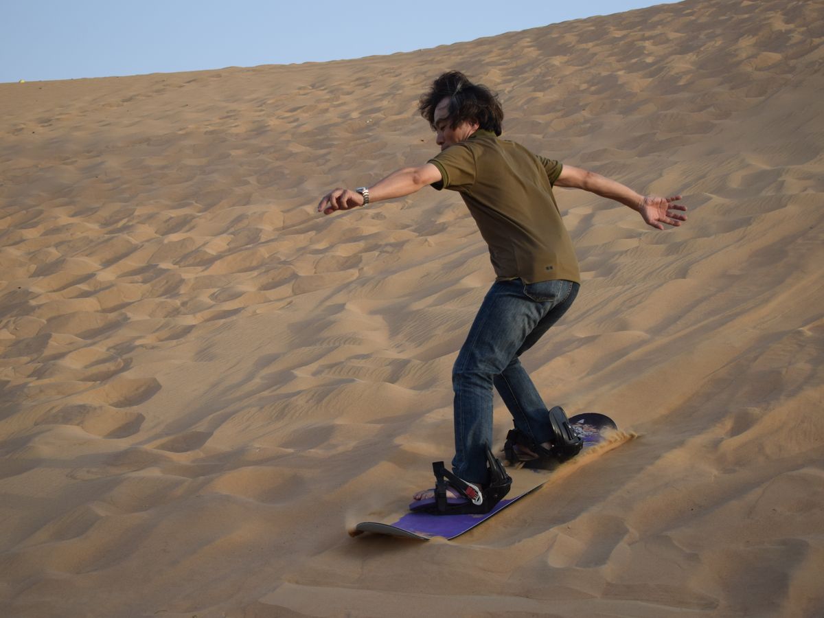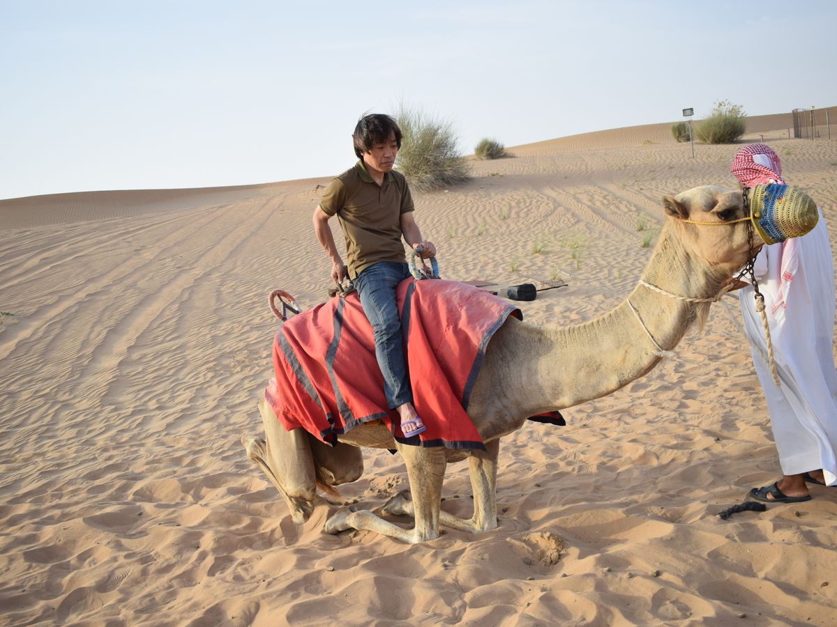 『デザートサファリ・ビュッフェディナー付ツアー』に参加させて頂きました。まずは4WD車のタイヤの空気圧を調整して広大な砂漠へ出陣! 砂丘のアップダウンをジェットコースター感覚で駆け抜けるのは実にスリル満点で、本当に面白かったです。デザートサファリを終えるとラクダ牧場を見学してディナー会場へ。キャメルライドやスノボを体験したり、満天の星空の砂漠でタンヌーラダンスやファイヤーショーを観ながらバーベキューを食べられて最高に楽しい時間を過ごせました。本当に参加して良かったですよ!