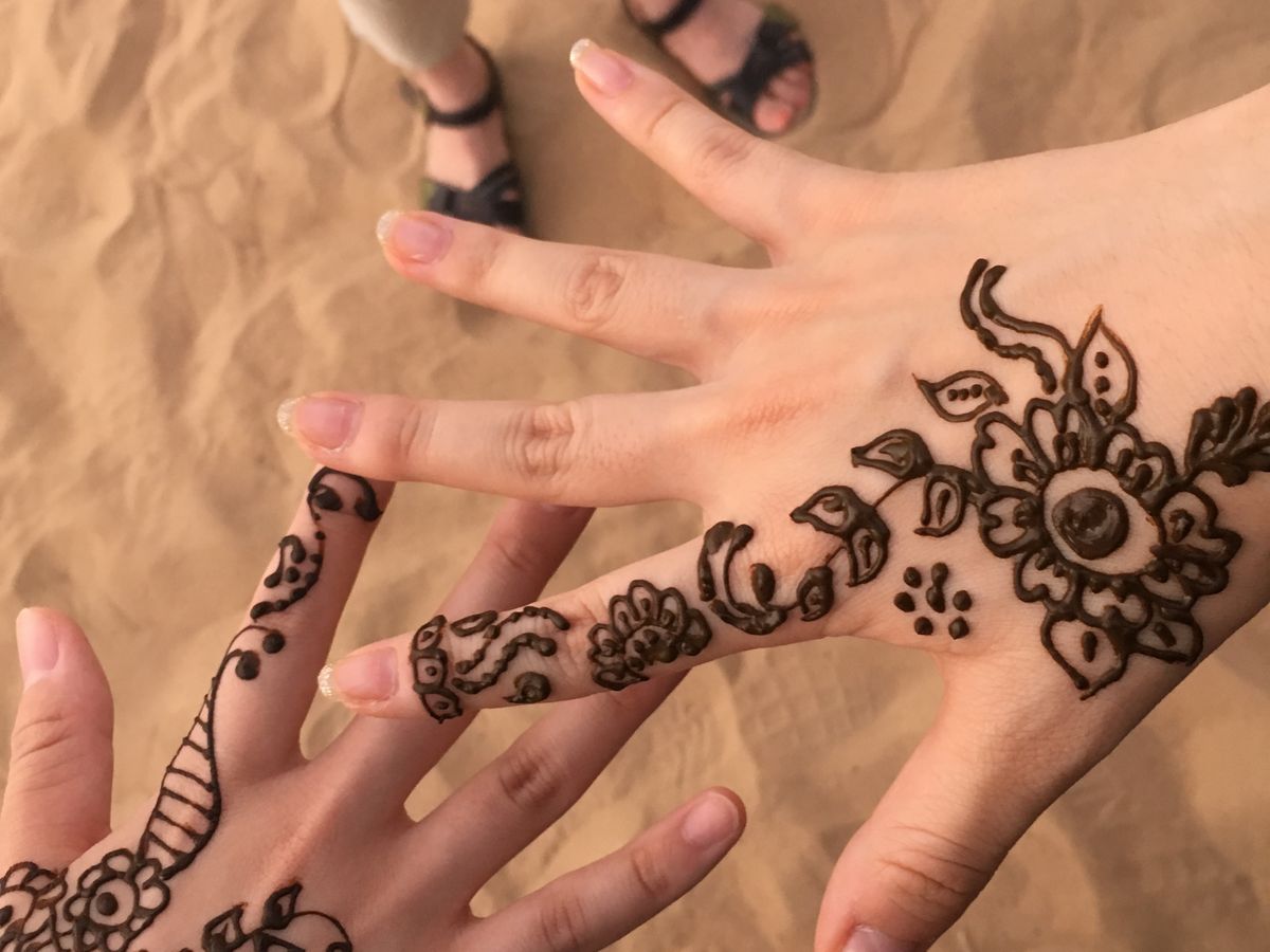 その後はラクダ農園でラクダと写真を撮って、専用のキャンプサイトに行きました。そこではラクダが乗れたり、水タバコが吸えたり、いろんなアクティビティが楽しめます。とくにヘナタトゥーを手に描いてもらうのが新鮮で初めての体験でした。