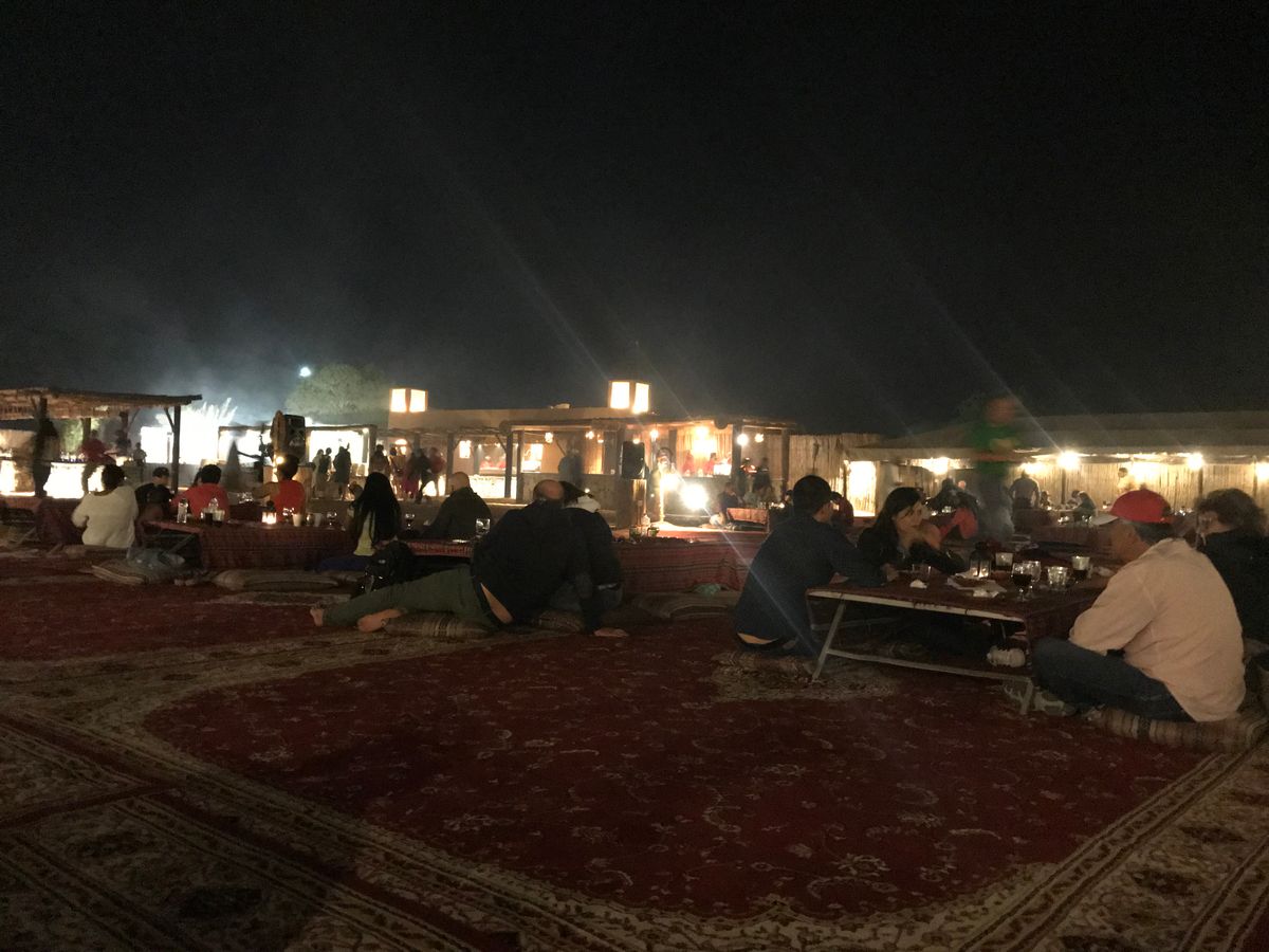 雄大な砂漠を見て、雰囲気のある場所での食事。アルコール付きにしたため、ビールやワインが飲み放題で、文字通り好きなだけいただけました。ただし、送迎や砂漠ドライブに使用する車が混載であるため、3列目の非常に座面が低くて座りにくい席を指定されてしまい、長時間のドライブでかなりの疲労を感じました。特に身長のある方は要注意です。楽しみにしていた砂漠ドライブの際にも、前列、2列目の方にさえぎられて、あまり前が見えない状態で,ただ振り回される感じで残念でした。また、他の車を見ると、確かに3列目まで乗車している車もありますが、多数の車は2列目までの乗車で快適そうでした。条件の悪い席でも同料金で、特に割引や事前通知もなく、非常に不公平感を覚え、楽しい旅の気分に水をさされた思いがして残念です。ただし、その他ツアー内容自体は満足できるものでした。