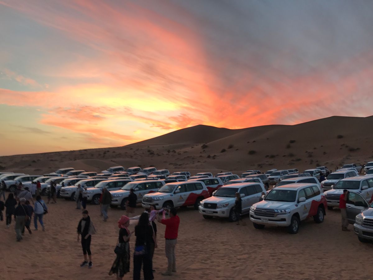 女子3人で参加しました。同じ車には同じく女子3人組が同乗し、年齢も近く、仲良く楽しく参加できました。年末年始ということもあり、ツアー会社のエリアに行くと同じツアーの車がかなりあり、砂漠で渋滞状態でした(笑)砂漠での4WD車の運転はなかなか迫力がありました。その後、日の入り時間に合わせてポイントへ連れて行ってくれ、夕陽撮影タイムをとってくれました。遮るものなく見る夕暮れは最高に綺麗でした。また、どこまでも広がる砂漠は本当に圧巻でした。