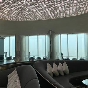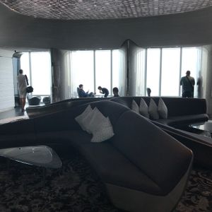 148階展望室へ行くには2回エレベーターを乗り継いで行きましたが、着いて早々にアラビアコーヒーとスイーツのおもてなしがあり、ソファーが置かれたりと特別な展望室でした。