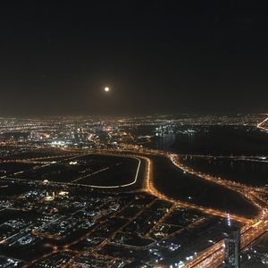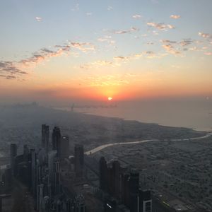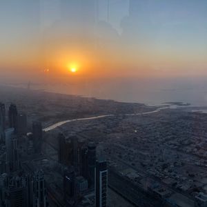 超近代高層ビル群を見下ろし、水平線に沈む日没からの夜景