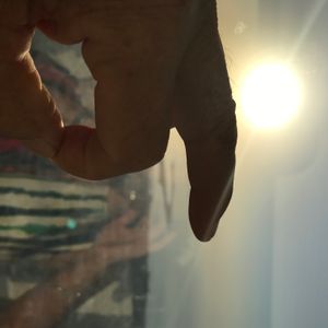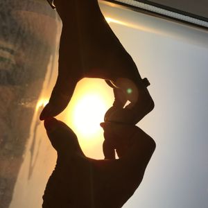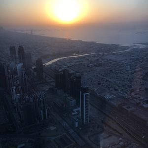 外を見たら、夕日の反射もありますが、光って外が見えにくい状態。少し回っている内に、ガラス1枚,しかも少し素通しのエリアへ出られることがわかり、そこから撮影したのが、添付の写真です。夕日を正面に見れる所まで行けないので、これが一番結果です。また、周りに高い建物がけっこうあるので、