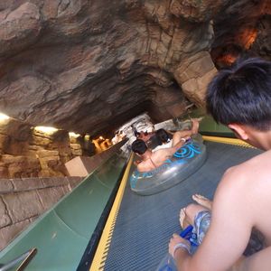ピラミッド型のウォータースライダーは傾斜がすごくかつサメの水槽に突入のような演出なので、Wの恐怖でした。