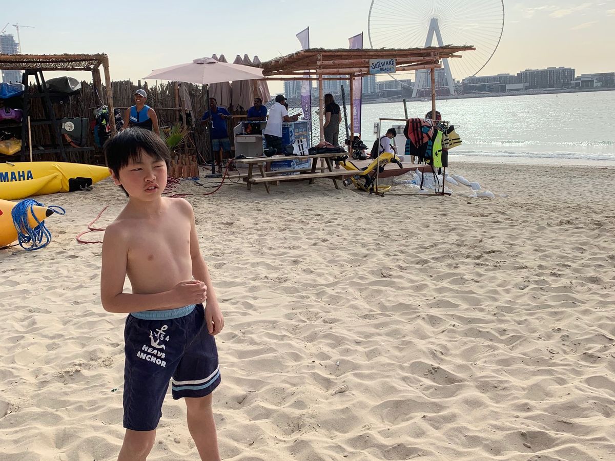 JBRビーチに泳ぎ&フライボードをしに来たついでに、気になっていたフライングカップに乗りました。下から見ると大したことない高さに見えるので、最初は子どもたちも余裕でしたが、実際に上がってみると40mはかなり高い!ほぼ全員がスマホ持参で乗っていますが、スマホを落としそうで怖いです。