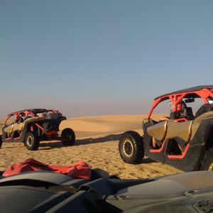 1月1日16時スタートのツアーを予約。当日は2時半にドライバーの方がホテルまで迎えに来てくれました。車には私達だけ、ホテルから砂漠まで車で走る事40分。道中はガイドさんがドバイについての色々と英語で教えてくれ楽しかったです。その後、砂漠の中にあるツアーの集合場所に到着。そこでは、運転する人の日本の免許証確認、デポジット(保証金)をカードで支払います。終了後、バギーの破損がなければカードからの引き落としはありません。英語で運転方法の説明や注意事項の説明があり、ヘルメットとゴーグルをセットして出発です!(カナダ製の最新バギー4人乗り、AT)