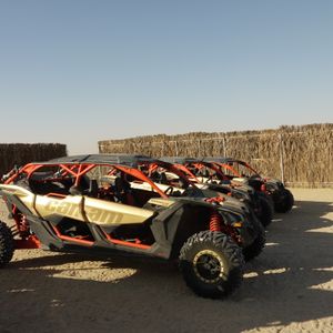 同じグループに私達以外にも、あと2組いました。ガイドの後ろを3台のバギーが一列に連なっていくスタイルで走ります。趣味で昔レースをしていた主人は大興奮!!何の障害物の無い、砂漠を大爆走!!砂漠の丘を上ったり、下ったり。平らな場所では、そこそこスピードを出すこともでき、とても気持ちよかったです。途中2度休憩タイムがあります。お水を飲んだり、写真を撮ったり、ドライバーを交代しているグループもありました。私達は主人のみ運転、私はずっと助手席で動画や写真を撮っていました。走行中はとても揺れるので、携帯での写真撮影は可能ですが、一眼レフのような大きなカメラでの撮影は難しいかもしれません。そして砂だらけになります。夕方、太陽が傾いてくると急に風が冷たくなり寒くなるので、夕方のツアーに行かれる方は上着を準備した方がいいと思います。でも、夕日と砂漠のコントラストがとても神秘的で感動的でした。