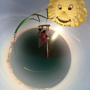 到着日のsunset時間に予約をしましたが最高でした最初15分だと短いかなぁ❓と思っていましたが体感的にはちょうど良かったです。自分達含め4組だったので待ち時間の事も考えると長すぎず短すぎずベストだと思いました。沖に行く時間も考えると2時間は見ていたほうがいいかもしれませんsunsetにビーチに戻って来ましたがちょうどラクダが歩いていてUAEを満喫出来ました。モニタープランだったので大変お得にパラセーリングを楽しめました。