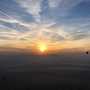 1つの気球には20人ほど乗れるらしく、気球の前に集められて説明を受けました。私たちは日本人のキャプテン(操縦する方)で、英語と日本語両方で説明して下さりわかりやすかったです。当日は少し風が強かったらしく、気球が降りるポイントよりもかなり流されたために1時間半ほど空の旅を楽しめました。朝日は雲が多いために、はっきり丸くは見えなかったですが…