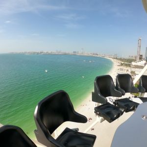 現地に来てモニター価格の案内が出ていたので、ホテルをチェックアウトして、アブダビに移動する午前中に予約しました。メトロとトラムを乗り継ぎJBRまで向かいました。レジデンス1で降りてから受付はちょっと分かりづらいのですが、表通りからビーチに行く細い脇道を入っていきリッツの方に向かいます。スタッフは明るく丁寧な説明で、娘と2人だったのですが、写真も沢山撮ってくださいました。実質は15分ですが、ボートを乗り継いだり、少し沖に出るので、1時間はしっかりみておくと良いと思います。200mの高さからの眺めは風も気持ち良くて最高でした!