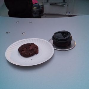 クッキーとカフェラテを注文したら、コップとお皿をもって座席へ。遊園地のアトラクションのような形で、シートベルトを締めたら上空へ出発です。