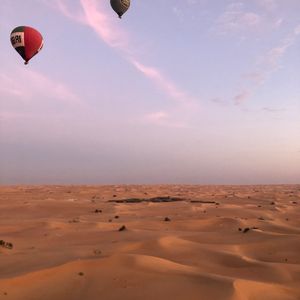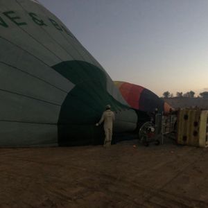 早朝の暗いうちにホテルへ迎えに来てもらい、車中は爆睡。現地の砂漠へ到着し車を降りたら、なかなかの冷え具合でダウンジャケットを着てて正解。気球の方はスタッフさんが準備中で、気球を膨らませる準備も見ごたえあり。スタッフさんからの説明で気球が膨らんだら、スタッフさんの指示で直ぐにゴンドラへ乗り込む。少し風があり気球と共にゴンドラも煽られたが、無事にテイクオフ!朝日が顔を出す前だったので朝焼けの砂丘が、とてもキレイで感動。かなり上空まで登り、周辺を周遊。とても素敵な時間が過ぎて着陸の時間に。離陸した位置に戻りつつ降下していくが、けっこうなスピードが出ていて、予めスタッフさんから指導を受けた着地姿勢をとり、なかなかの衝撃と共に無事にランディング。ゴンドラを降り、朝食の場所へと車で移動し、朝日が昇る爽やかな中で、美味しい朝食をいただきました。