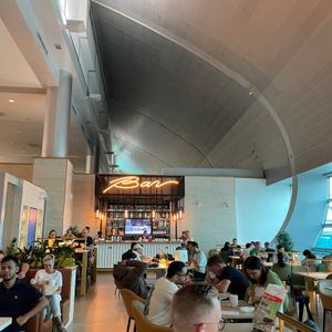 事前に予約してたけど、長蛇の列に並びます。受付横に立っているフロアマネージャーみたいな女性に、予約あるけどと声をかけたけど、並ばなきゃいけないとのご指示。20分くらいでようやくチェックイン。結構混んでいて、ソファー席は満席、高いスツールと大テーブルにいくつか空きがある程度。大テーブルに席を確保、途中でボックス席に移動しました。スパークリングワインはありません。スナックもあまりお腹にたまるものは少ないです。5時間以上の乗り継ぎを助けてもらい、ありがたかったですが、クオリティはもう少し期待してたんですが、、、