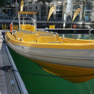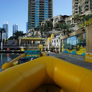 ドバイマリーナの夜景を楽しめればと思い、18:00からの60分コースに参加しました。乗り場の一帯はイエローボートが借り切っているエリアなのか、黄色いボートが海に並んでいて、すぐに集合場所だとわかります。黄色いボートは目立って良いですね。
