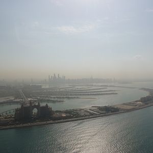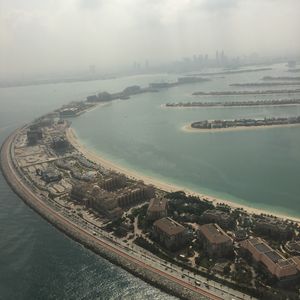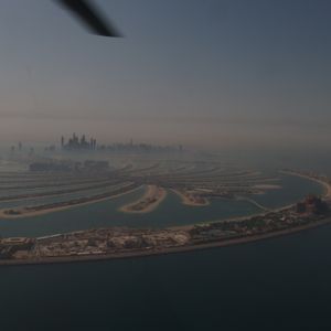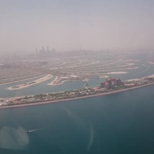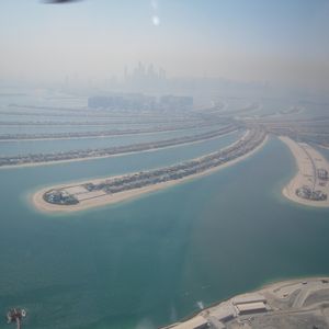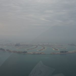 世界一高いビル、ブージュカリファ付近を通過した後、世界一の人工島、パームジュメイラ上空へ。私達はここに泊まりましたが、地上から見るのと上空から見るのとでは雲泥の差。不思議な形の島にホテルや豪華別荘が建ち並ぶ様は壮観でした。