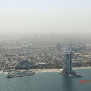 この国の車の半数が日本車ということもありレクサスでホテル空港間約20分、英語しか喋りませんが明るい気さくなドライバーさんでした。モールの近くのヘリポート待合室に着くと簡単なレクチャー(日本語混ざりの英語)があり、その後待ってる間にコーヒーサービス、貴重品を金庫ボックス(建物外の鍵付き)に入れセフティジャケットを装着して搭乗、我々4人とパイロットの5人乗りヘリコプターでした、(日本人は我々だけで他に中国系ヨーロッパ系等々で待合室は混雑)朝9時30分のフライトでしたが上空から市内を見るとサンドダストで何となくモヤが掛っている感じ、それでも街の雰囲気は充分味わえ、特にドバイの魅力パームジュメーラは絶対上空からしかスケールや概形は解りません。なので大満足、あっという間の22分間でした。パイロットは英語のみ、トイレは待合室には無くモール(100m)まで車で送ってもらいました。