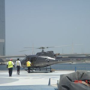 しばらくしてヘリコプターがやってきます。真っ黒いかっこいいスタイル。エアバス社製でいけてます。ジェットエンジンがあるので、機体後部から近寄るなと注意を受けながら近づきます。熱風で全身やけどしてしまいます。ローターの回転数が落ちてきたところで乗り込み、シートベルト着用。その後離陸となります。初ヘリでしたが、スムーズな離陸。そしてあっという間に上昇していきます。Dubaiの町並みの高層ビル群やどこまでも続く砂漠と海が見渡せます。もちろん、22分コースの醍醐味である、バージュカリファから先の、パムジュメイラやその下の豪華別荘エリアまでこれは絶対22分コースのほうがオススメです。ブルジュ・アル・アラブもおっきいです。興奮気味に写真やムービーを撮り続けてあっという間のフライト。着陸時もゆっくりとアプローチして、そっと着陸。ローターの回転数を落とし、完全に止まってから、シートベルトを外して降機します。降機後は記念撮影OK。あの尊敬すべき高○先生になりきった雰囲気で撮影した写真は、宝物です(笑)