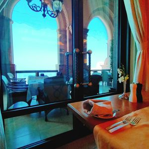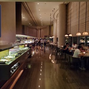 開店時間に予約しましたが、10分遅れで到着。タクシーでホテルに行けば、間違わずに行けます。ドバイモールからなら、完全に迷います。しっかり歩きます。レストランでは、しっかり人を見られます。テラス席は、いっぱいだそう。とりあえず、店内の席で。空いたら、テラス席へ案内して欲しいとボーイに伝え、いざ食事へ。ブッフェのは、このクラスの料理としては普通。飲み物は、ソフトドリンクもすべて有料。テラス席の空いたブースには自由に出入り出来ます。噴水ショーも、遠目で見れます。1時間後、今日はテラス席は、空かないと、ボーイが。空き始めた席もあるのに。流石に一流ホテルは、宿泊客を大事にします。開店前に並んだであろう中国人と宿泊客の欧米人のコントランス。次はないかな。