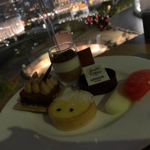 食事をしながらドバイファウンテンを見れるのかと思って、18時半から予約しましたが、時期が10月だからか、外の席に案内されてる人はおらず室内の席でした。室内からはドバイファウンテンは見づらいため外に出て見ていました。ご飯はブッフェなので予想通りでしたが、中華が多い印象です。服装も、スマートカジュアルとあったので主人は革靴を持っていきましたが、全然心配する必要ありませんでした。女性はカジュアルなサンダルやショートパンツ、男性もハーフパンツにスニーカー、サンダルの方がたくさんいましたので服装は気にしなくていいと思います。ホテルへの行き方ですが、Googleの地図で検索し歩いて行こうとしましたが、全然たどり着かない!Googleは歩ける道を示してるわけではなかったので、地図で見たらドバイモールから徒歩数分でも、通れないのでドバイモールからぐるっとまわって20分以上歩きました、、、、。予約の時間も迫ってくるし、本当にこっちであってるのか不安で気が気ではありませんでした。徒歩でアルマーニホテルに行っている人はいなかったので、近くてもタクシーを使う方がいいと思いました。値段を考えるとリピートはないです。ドバイモール内でもいくつもテラス席で食べれるところがあったので、次回行くとしたらそちらを選びます。