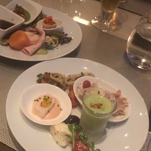 レストランがアルマーニホテル内にあることで、内部は非常に落ち着いた雰囲気で高級感が漂っていました。食事も多くの種類が用意されていて全てが高品質でおいしかったと感じました。噴水ショーはテラス席に出て全体を見渡すことができます。誰にも邪魔されない特等席でした。