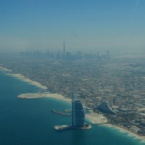 急速に発展を遂げた近代都市ドバイ側を上空より♪