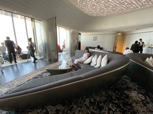 有る程度集まると呼ばれて、みんなで移動し、エレベーター乗り場は行きます。係の人が先導してくれます。そのままエレベーターで、148階へ上がると、ソファーのあるラウンジが待ってます。ウェルカムドリンクとして、アラビアンコーヒーとデーってなどいただき、その後ゆっくりとカプチーノを飲みました。滞在の制限時間はなく、サンセットタイムのチケットはとれなかったのですが、見ることはできました。