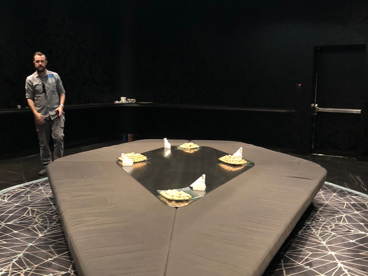 エレベーターに乗る前の待合室でデーツとアラビックコーヒーを振舞われ行列に並ぶことなくエレベーターへ。そして簡単な説明を受け一気に148階に到着。そこでウェルカムドリンクとお菓子をもらい148階からの景色を堪能し