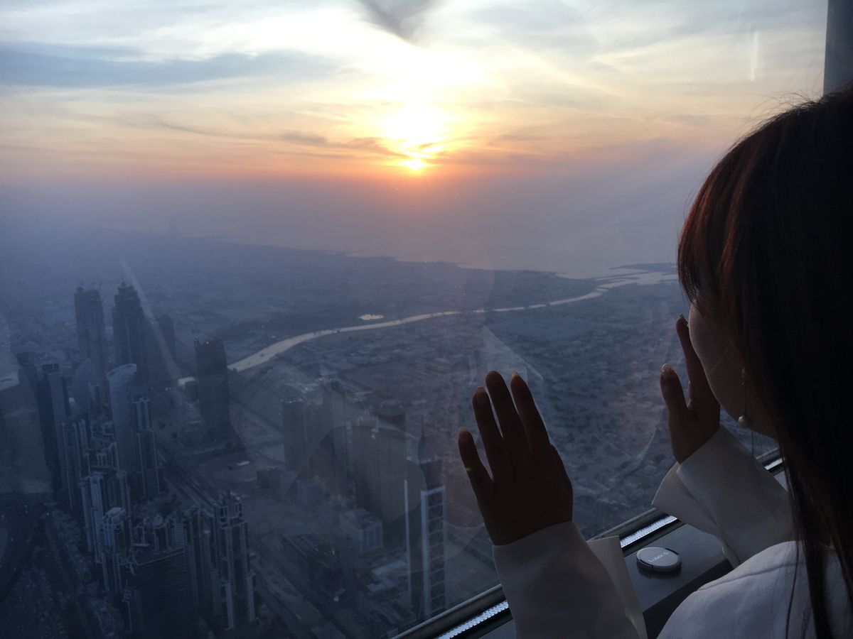 高層ビルが好きな友人と2人で参加。せっかくなので昼景、夕景、夜景すべて楽しみたいと5時に予約。近代的なビル群には建設中のものも多くあり、刻一刻と発展する街並みに勢いを感じます。また昔ながらの街並みやクリーク、海岸線とドバイのほとんどを一望できます。特に夕景、夜景はおススメです。15,000円は高いですが、555mからの景色は圧巻。少し狭いですがデッキもあり、風を感じながら写真撮影できるのも嬉しいですね。148階はタイムリミットがありますが、1時間も楽しめれば十分。のちにリミットの無い125.124階へ降りることができますが、夜景に向けて混雑がピークになってくるので降りるエレベーターも長蛇の列に。AT THE TOP(148階)のチケット所有者は優先的にエレベーターに乗せてもらえるので覚えておくと便利です。トータルで2時間以上いましたが、フロアそれぞれと降りた1階にもお土産ものがあり、ここ限定のものもあります。上で買う方が多いのか1階のショップには客が少なくゆっくり買い物ができました。受付の場所もドバイモール内に案内表示がありすぐ分かります。ただ、バウチャーを持っていてもチケットに換えるまで並ぶ必要があることや、モール自体も尋常じゃない広さなので、時間には余裕を持って行くことをお勧めします。ゆっくり楽しみたいのであれば、カリファの展望台とモールで1日と考えれば良いと思います。僕たちの場合はそれでも行けなかった店がある程でした。