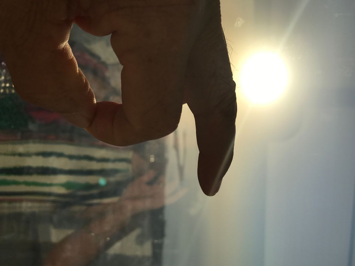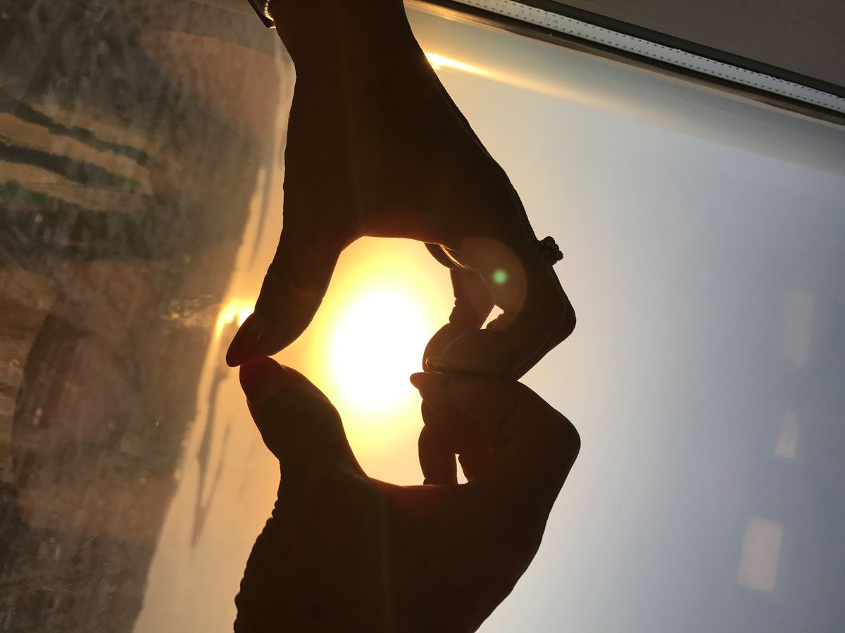 外を見たら、夕日の反射もありますが、光って外が見えにくい状態。少し回っている内に、ガラス1枚,しかも少し素通しのエリアへ出られることがわかり、そこから撮影したのが、添付の写真です。夕日を正面に見れる所まで行けないので、これが一番結果です。また、周りに高い建物がけっこうあるので、