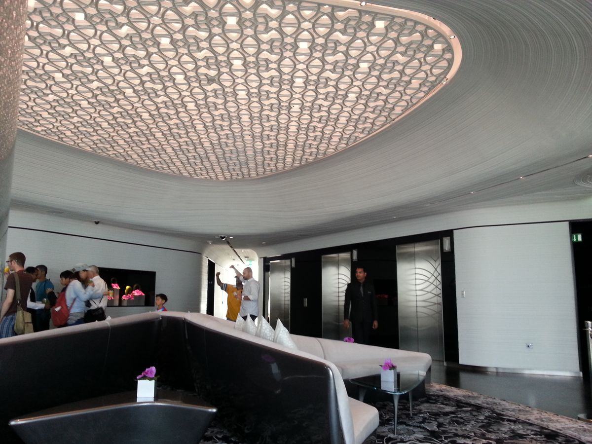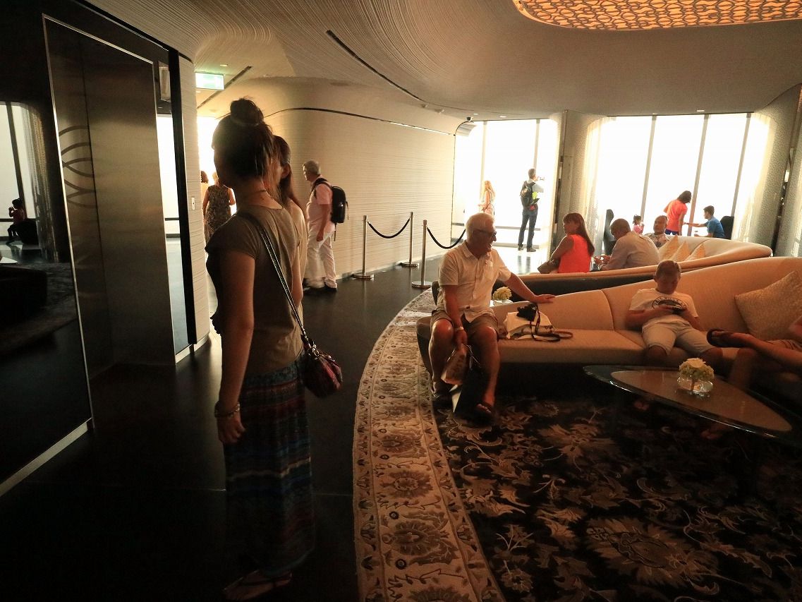 ロビーの広がりがゆったりしていてラグジュアリーな空間。ジュースとスイーツを持ったスタッフがもうスタンバイ。 148階からの眺めはもう絶景で遠くの砂漠、スーク、私たちがステイしているホテルまで見えてとにかく圧巻でした。