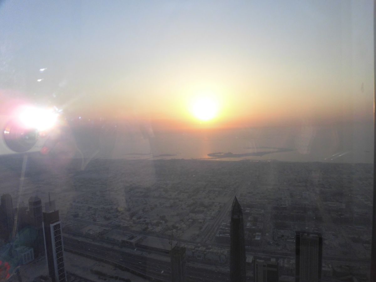 5時半からは料金があがるので5時のチケットを予約しました。124階の展望台は外に出ることができ,目の高さのところはガラスも入っていないので,直に景色を見ることが出来ます。夏で湿度が高く,遠くは霞んでいて,バージ アル アラブもパームジュメイラも見えませんでしたが,ドバイの市街地を一望することができます。ドバイファウンテンもここから見るとまた違う趣があります(下から見た方が迫力はありますが),私たちはせっかくなので展望台でねばって夕日を見て,ドバイの夜景も見てから降りました。霞んでいないときにまた行きたいです。