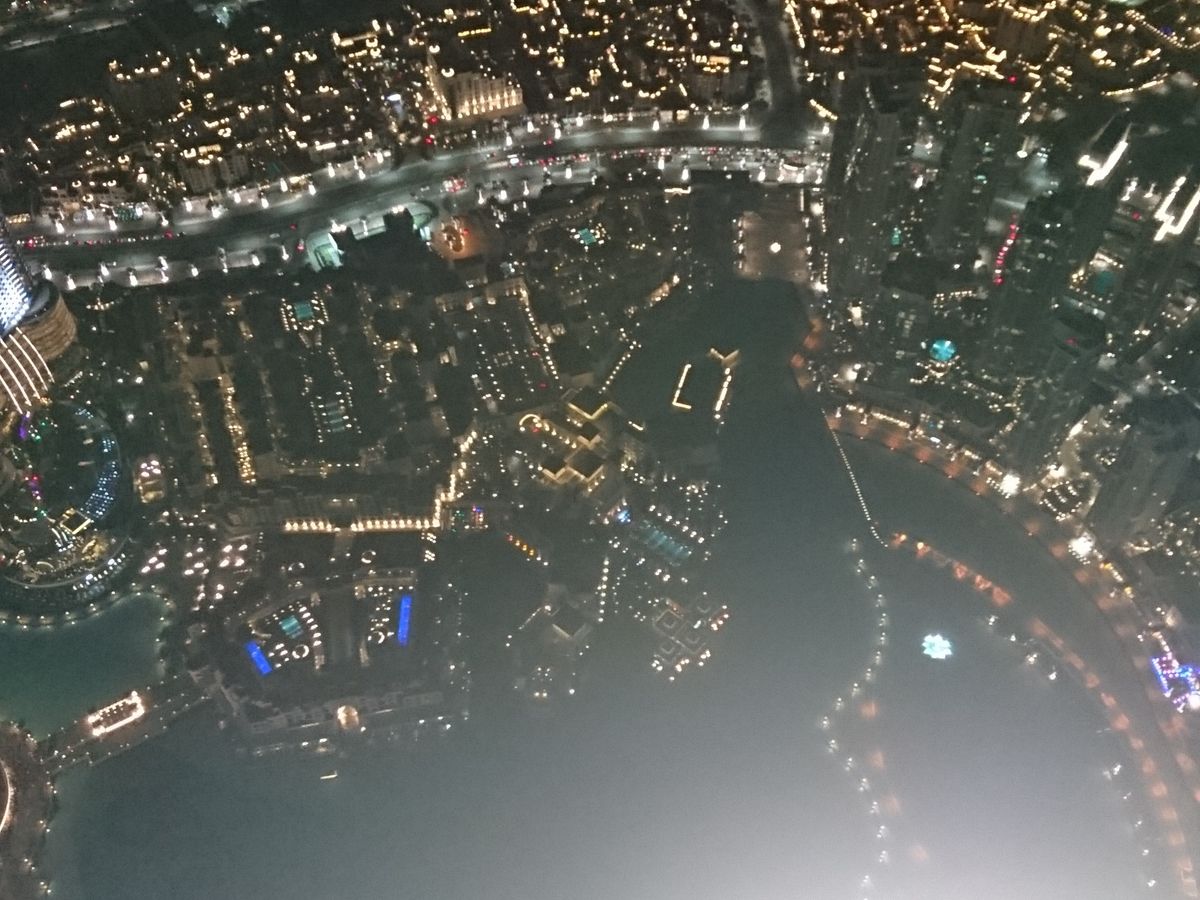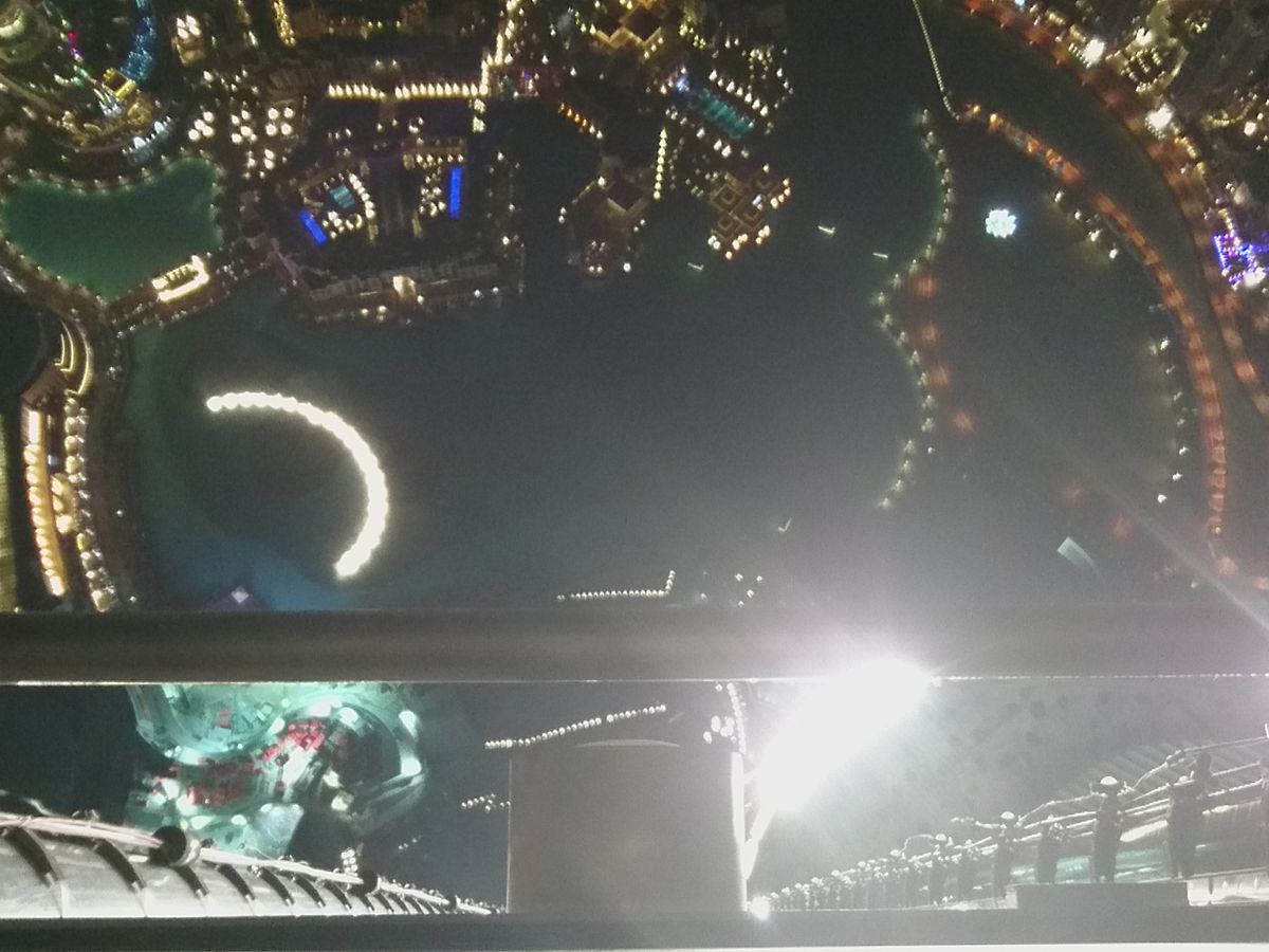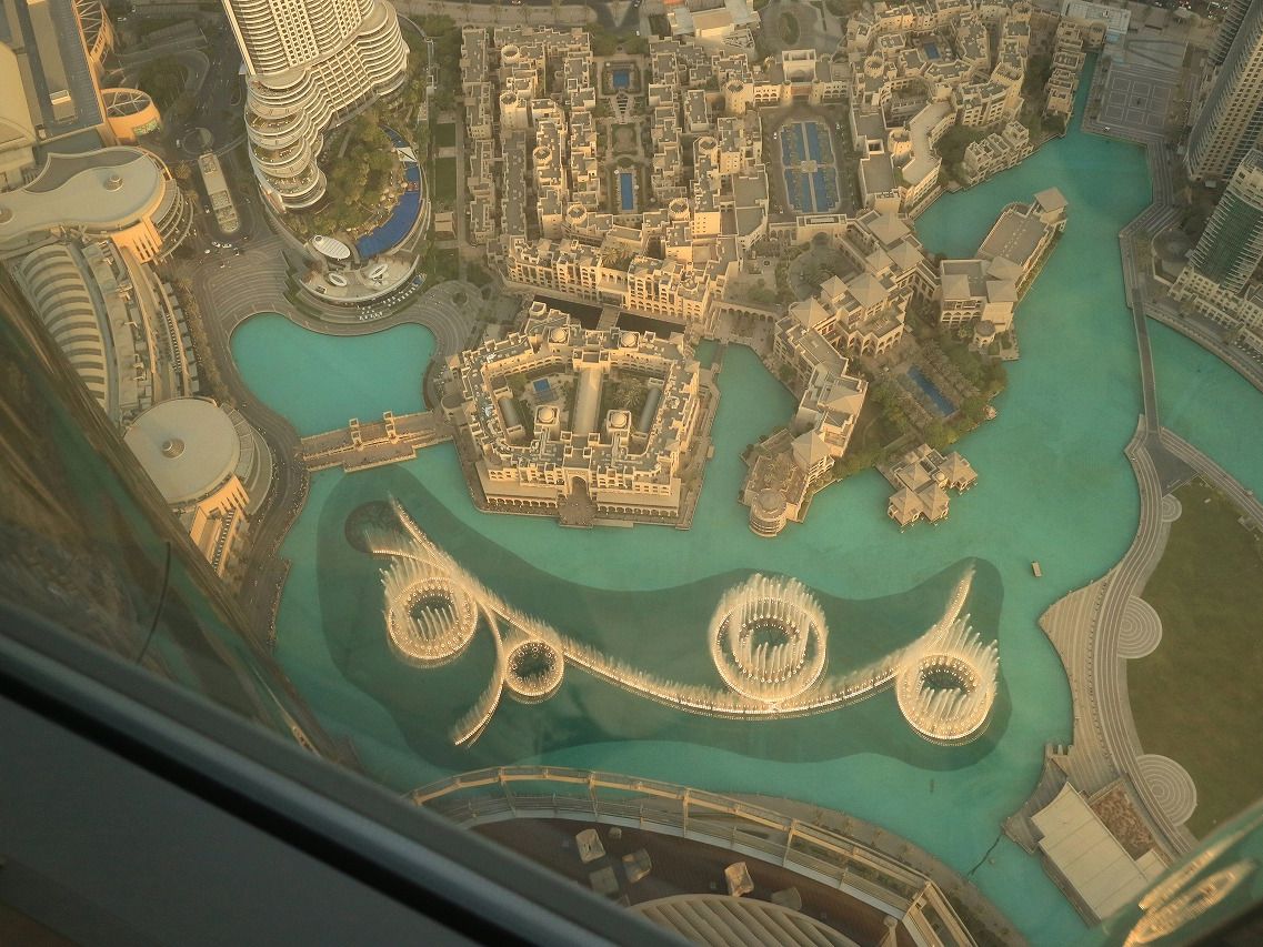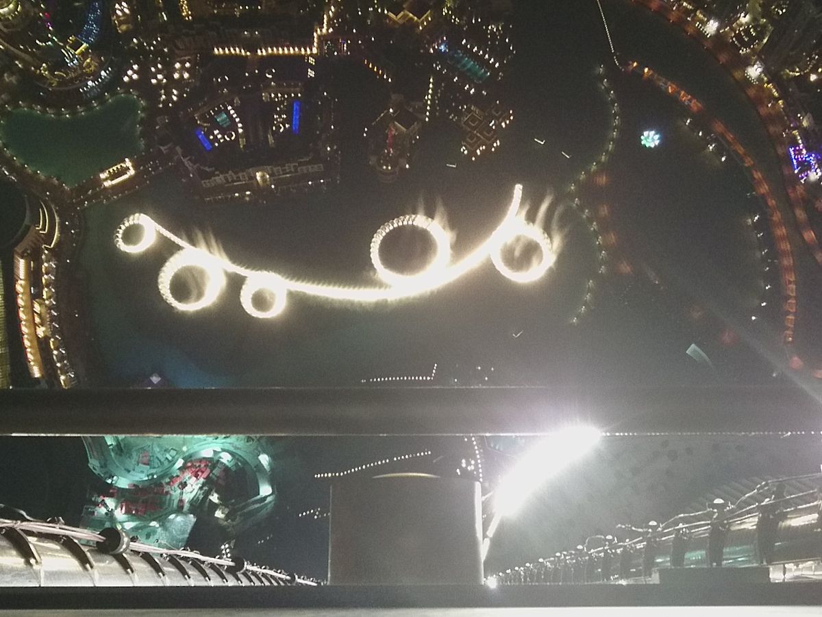 124階と迷いましたが思い切って148階にしました、専用ルームで待機はただ座ってお菓子などあるので食べるのですが誰も手を出してませんでした(笑)そこからエレベーターで125階そこから乗り換えて148階です、夜8時に予約したのですが上に行ったのは8時半でした、夜景が凄く綺麗でした、一部の場所は窓の部分に隙間が空いてて手を外に出して写真撮れたりしますが、カメラ持つ手が超緊張します(笑)ただ砂漠の国なので窓が汚かったのががっかりです、これはどこの窓も汚かったです、Funtainも上から撮れます。