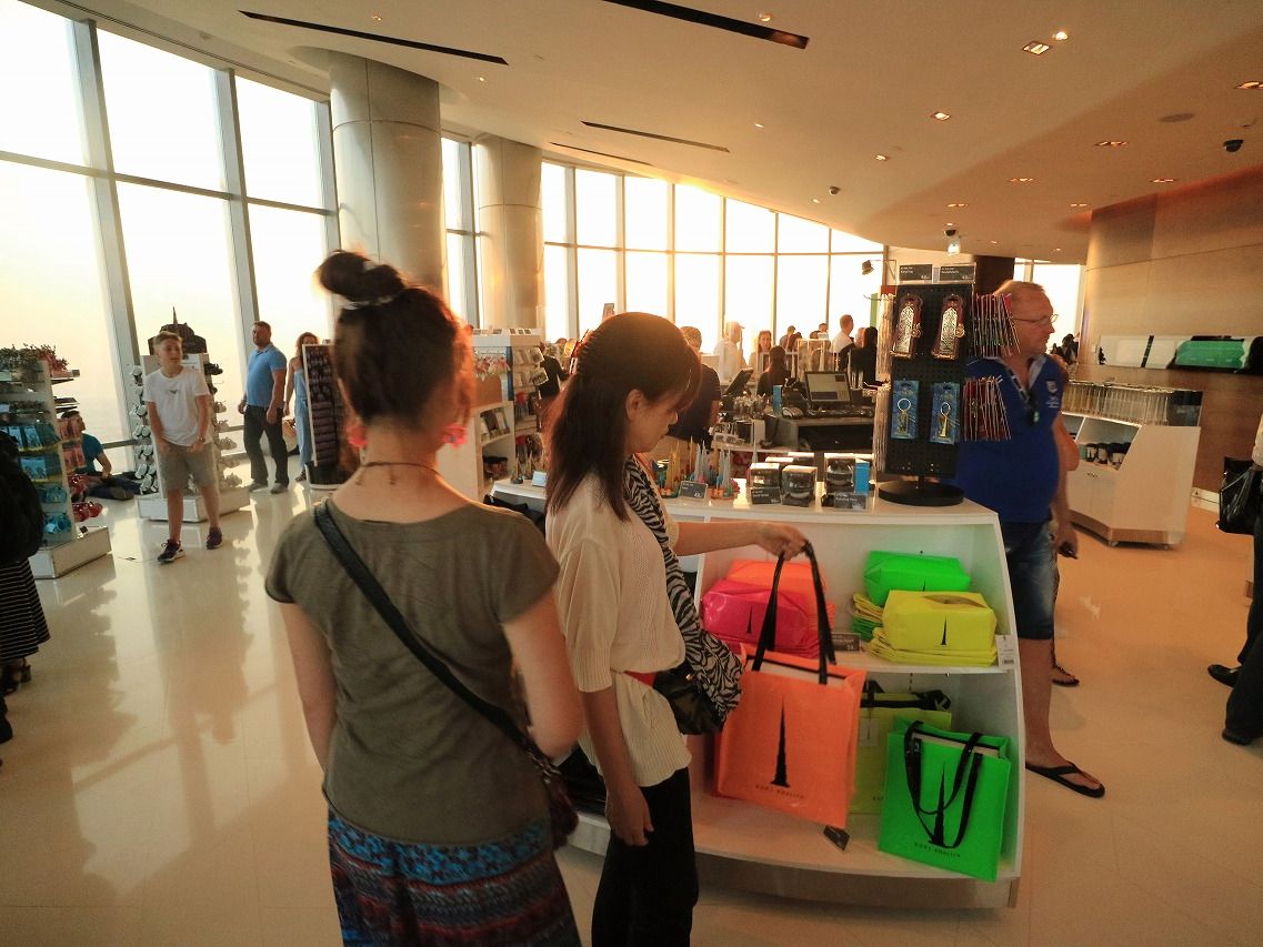 124階に行くのと148階へ行く値段の差に驚きましたが、子どものお願いで148階へ行くことを決定・・・。せめて、事前予約で少しでもお得にとこちらで予約しました。当日は18時に予約をしていたのですが、まさかの事故大渋滞でホテルアトランティスから1時間以上かかってしまい、遅れて19時頃に到着。でも、入場させてもらえました。148階へ行く人たちはまず、ラウンジに案内されナツメヤシのスイーツとアラブコーヒー(普通のコーヒーとは違います)でおもてなしを受けます。早く上がりたい気持ちを抑え、案内を待ち(10分くらい)10人くらい一緒に案内役の係りの女性と上がります。148階に上がると混雑は全くなくオレンジジュースや青りんごジュース、チョコレートのおもてなしがまたまたあります。滞在時間が決められているという説明がありましたが、混雑していないときは長時間でもいられるようです。外にも出れますがかなりの強風。砂漠の中にできた都市であることを実感します。148階にも小さいお土産屋さんもありますが、結局 種類が多い、124階と1階に下りて来たときに購入。