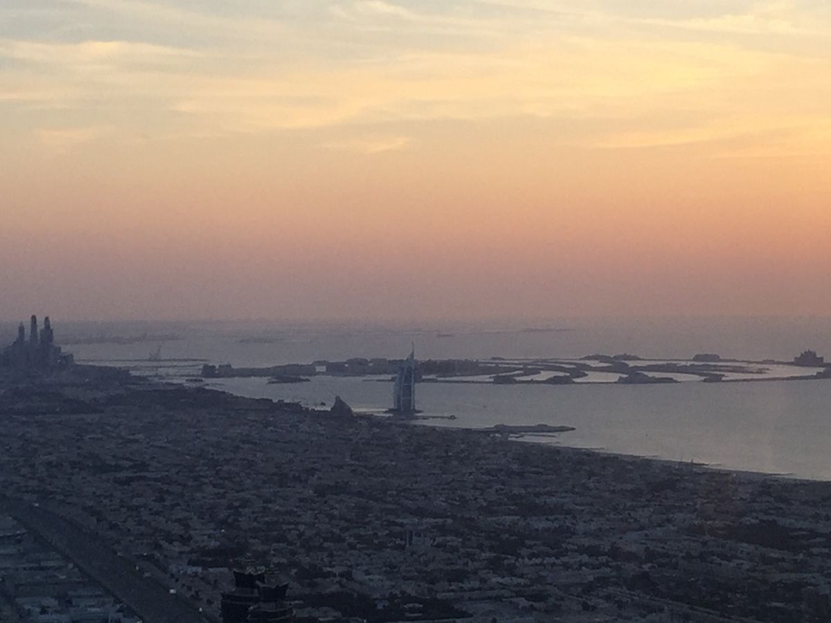 直前に申し込み、ミラノへ行く途中に1泊だけの滞在でしたがホテルからも近く、素晴らしい景色だったので、行って良かったです。ドバイモールの中に入り口があるので、早めに行ってランチをしたり、ショッピングしたり、終わってからもモール内のアクアリウムに行ったり時間を持て余すことはないです。展望台入場するときにチケットの時間に入り口のスタッフに声を掛けると、右横の待合室に通されます。そこで説明を受けますが、英語なのでところどころしか分かりませんが、グループごとに行動するので、ついていけば大丈夫です。最初、荷物のチェックがあり、余分な荷物は入口左のロッカーに預けないと入れないので、そこに預けて最上階まで行きました。最上階は小さなホテルのロビーみたいで、すぐにジュースとかをスタッフが持ってきてくれます。ソファーに座って窓の外の景色を見ているとやはり砂漠の中にあるんだと実感します。ドアを開けて外にも出れるので、こんな展望台はなかなかないので、是非行かれることをお勧めします。