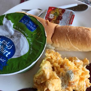 モーニングの内容はパン、チーズ、スクランブルエッグ、ヨーグルト、インスタントコーヒーなどです。