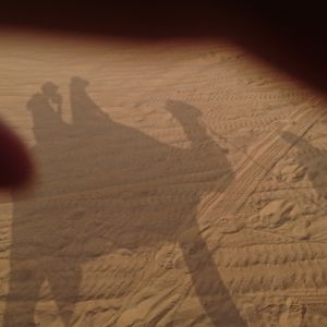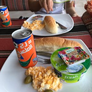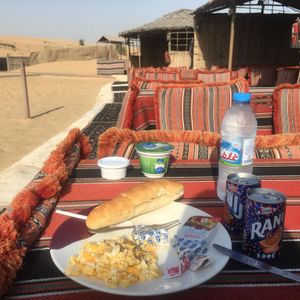 その後、場所を移動してラクダに乗るのですが、実質1分くらい、ゆっくり歩いて終わりでした。希望者は水タバコを吸って、砂漠の中の小山?で朝食(パン、スクランブルエッグ、ヨーグルト) を食べて3時間強のツアーでした。