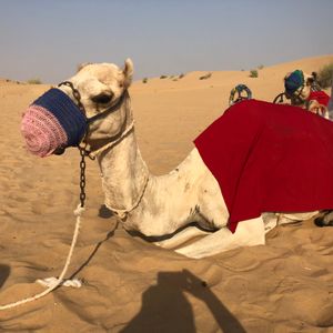 ・ラクダに二人ずつ乗りました、くるっと辺りを一回りするだけですが非日常を体感できます。