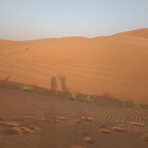 砂漠では風で顔や体が砂だらけになるので、顔を覆うためにスカーフを持参したり、サンダルできて、もはや裸足で歩いた方が良いです。