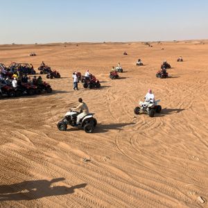 砂漠のドライブ、ラクダ乗り、ハヤブサ乗せ、バーベキュー、ショー見学など全て合わせての値段としてはかなりコスパが良いです。ホテルでピックアップしてくれたSUVドライバーが、砂漠をドライブする特殊なライセンスを持っており、そのまま、その車で砂漠を爆走します。途中、タイヤの空気を抜くために、マーケットの様なところに寄り、希望者は有料で四輪バイクを体験できますが、乗らない人には物売りなどが溢れる中で、何の説明もなく無駄な時間を過ごさなければいけないのが少々難点で、有料のラクダ乗りなどもあってこれが今回のアトラクションの一部かと勘違いしてしまう人もいるかも知れません。