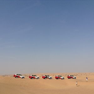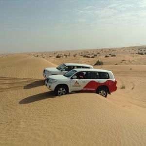 5:00着のフライトで利用しました。ディナー付きのツアーと迷いましたが、夕方から夜はバージュカリファを優先してモーニングデザートサファリを選びました。集合場所のホテルは第一ターミナルから近いですが、グーグルストリートビューで見る限り歩いて行けそうもなかったのでタクシーを利用。ホテルのウェブサイトに価格30ディルハムと記載されています。タクシーでも地図上の距離よりはだいぶ遠回りになります。8:00ピックアップで空港周辺は朝の渋滞時間帯でしたが、途中ドバイアウトレットモールやラクダのレーストラックなどを横目に1時間弱で広大な砂漠の入り口に着きました。一旦車を止めて他のツアー車両と合流し、砂漠走行用にタイヤの空気圧を下げてデューンドライブが始まります。ランクルのタイヤにはラクダのマークが付いていました。最初のうちは整地された道路を移動しますが、途中から砂丘に入ると本当にローラーコースター以上のスリルが味わえます。ランクルはマニュアルトランスミッションで1速から3速位までを使いますが、砂丘の急勾配急カーブを片手ハンドル片手シフトノブで運転するドライバーさんとランクルの凄さを思い知りました。途中見晴らしの良い所で小休止したあと、再スタート後に2台がスタックして救出するハプニングをへて、次のアクティビティ会場へ移動します。トイレ休憩の後、ラクダライドとサンドボードを体験できます。個人的にはランクルよりもラクダの方が落っこちそうで怖かったです。その後ブランチボックスとドリンクで遅めの朝食になりました。普通の朝食後にデューンドライブは危ないと思います。食事終了後はピックアップホテルまで送ってくれて12:30過ぎに解散となりました。その後15:30からのバージュカリファの展望台を予約していたので、メトロやトラムで少しウロウロして16:00頃に展望台に登りました。夕日を見て下に降りてドバイファウンテンを見てからモールで買い物をして空港に21:00頃に戻りました。長時間のトランジットを満喫することができました。ディナーサファリに比べると参加人数も少ないと思うのでオススメです。