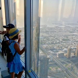 50階建てビルの三倍!?ですよ。入場時間は決まっていますが、降りる時間は決まっていないので、心ゆくまで高所からの景色を堪能できます。当日券売り場は結構な混雑でしたが事前予約のバウチャー引き換えはスムーズに進みました。怖がりなので、エレベータに乗る前にやっぱり怖い、やめようかなどを呟いていたら、スタッフさんがエレベータに乗っても振動もないし、液晶モニターの説明を見ていたら到着しちゃうからと言われ涙目で乗り込みましたが、驚くほどスムーズ。エレベータだけでも経験する価値がある価値があると思いました。砂漠にあれだけの建造物を建て都市を作ったドバイは一見の価値があると思います。