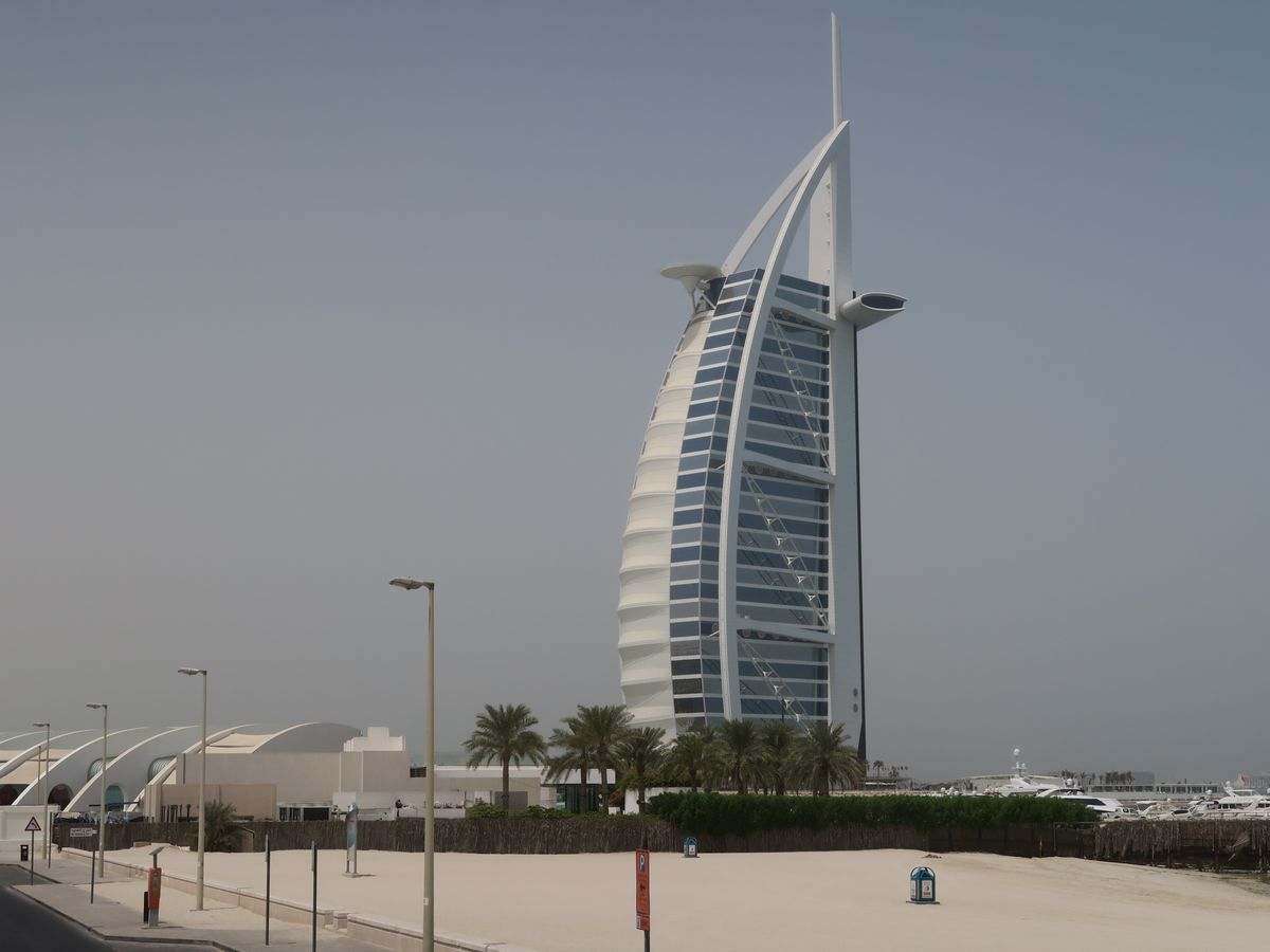 Green Lineはこのツアー3種類のうち、近代的なドバイの街の象徴を中心に巡るツアーです。(14)the Dubai Mallを出発したバスは(17)Jumeirah Mosqueなどを通り、海岸近くの通りをPalm Jumeirah方面へ。バス車内ではイヤホンにより要所要所で12カ国語での説明があり、日本語も含まれています。短かくても要領よく解りやすい説明でした。紙面による説明も同時にあれば、さらにドバイの理解につながると思います。バスはBurj Al Arab方面へ。超高級ホテルで、ヨットの帆を模した威圧感のある様相です。バスは、大通りから海岸通りへ入り、(21)Jumeirah Public Beach近くまで回り、写真撮影がしやすい位置で一時停車してくれます。