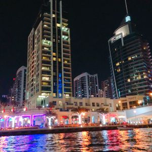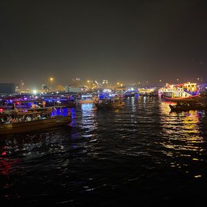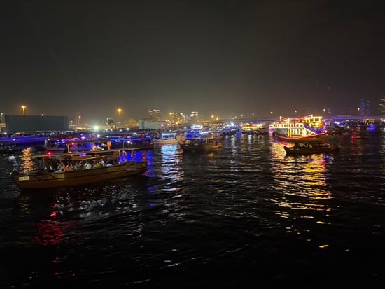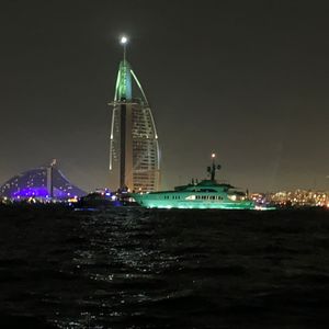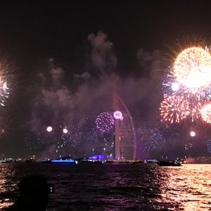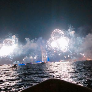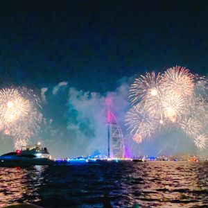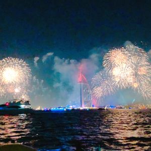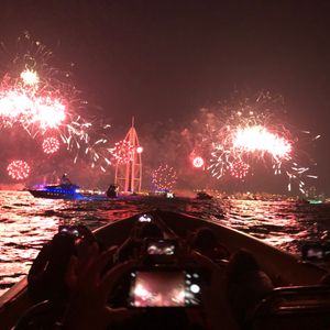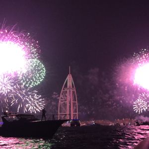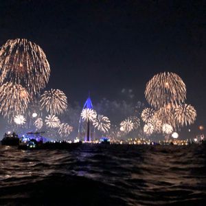年末年始のカウントダウン花火を見に行きました。日本人だらけでした。ドバイの街中の夜景を見ながら運河を抜けて、真っ黒な大海原に出たらジェットコースター並みの大爆走が始まります。座る席によってはしょっぱい海水をだいぶ浴びるので、汚れてもいい服やカッパで行かれた方がいいと思います。それでも私はとても楽しかったです。花火スポットについてから揺れる海上で1時間ほど待機している間に、見事に全員酔いました。この時間は要注意です。ですが、海上から見る花火はステキで、とてもいい思い出になりました。もっと近くで見られたらもっと満足できたと思います。