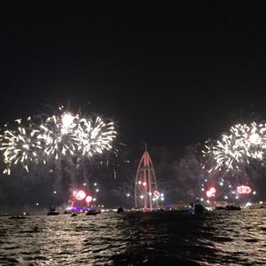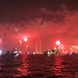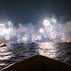 ラバー製のイエローボートに乗って、海上からカウントダウンの花火を見に行ってきました。まったりした花火鑑賞を想定していたのですが、2時間のコースの半分以上がパワーボート航行のスリリングな体験でした。水しぶきはあびるは、少し気持ち悪くもなるはで、少し想像と異なりました。年配の方には不向きだと思います。しかしながら、ボートから見た街並みと花火は最高でした。
