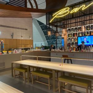 事前に予約してたけど、長蛇の列に並びます。受付横に立っているフロアマネージャーみたいな女性に、予約あるけどと声をかけたけど、並ばなきゃいけないとのご指示。20分くらいでようやくチェックイン。結構混んでいて、ソファー席は満席、高いスツールと大テーブルにいくつか空きがある程度。大テーブルに席を確保、途中でボックス席に移動しました。スパークリングワインはありません。スナックもあまりお腹にたまるものは少ないです。5時間以上の乗り継ぎを助けてもらい、ありがたかったですが、クオリティはもう少し期待してたんですが、、、