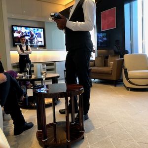 待機室が特別にあり、そこで待機。時間がくると、専用のルートからエレベーターへ案内され148階専用階へ。デザートと飲み物の提供。19時の回でしたので、日没前と後とどちらも堪能できました。148階からの景色は素晴らしかったです。