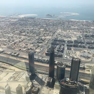 日の入りからの夜景がみられる時間をと迷ったのですが、他の予定との都合で日中の予約でした。チケットを引き換えるとラウンジに案内してもらえて、待っている間にアラビックコーヒーとデーツのサービスがうけられました。時間になると案内の男性から声がかかり他の方々と一緒に移動します。着いたら各自自由に見て回れるのですが、ここでもお菓子とジュースのサービスがありました。上から見下ろした地上は空港がちかづいて低空飛行している飛行機から眺めているような高さでした。エレベーターもすごくてあっという間に展望台に到着しますよ☆