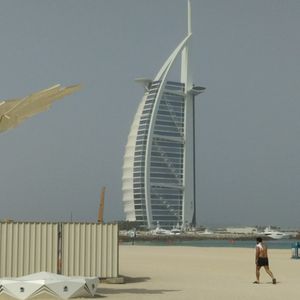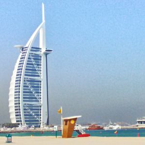 9:30にスリランカ人のチャビーさんがホテルに迎えに来た。日本語堪能、他にもドイツ語、英語もオッケー、1994年からドバイ在住とのこと。次女と二人だけ、他にお客はいない。ラッキーである。まずは世界が認める最上級リゾートホテルであるバージュ.アル.アラブを眺めることができるジュメイラビーチに到着。アラブ海の青と帆をイメージさせるホテルは絶好の撮影ポイント、シャワー設備もあり海水浴もできるが、本ツアーにはそのような時間はない。砂浜に絵模様が着いていて不思議に思うと、目の先に動くローラー車が版画の如く模様を産み出していた。次に向かうはジュメイラモスク、内部の見学は本コースに入っておらず残念。青空に白いドームと2本の尖塔が映え美しい。次はドバイ博物館、この日は休日で大にぎわい。我々が入館を待っている間にガイドがチケットを買ってくれ、時間ロスなく中に入る。昔の暮らしから今のドバイにいたる時代の流れが展示されている。ガイドの案内があるから、分かりやすかった。その次に本ツアーで最も気に入ったアブラという渡し船、いわゆる海上タクシーだ。クリークで分断されたバールドバイとデイラ地区を結んでいる。他のお客と乗り合わせることなく3人でスタート、何隻もの船が往来している。渡った先は古い街、中を歩くにはガイドがいないと迷子になりそうだ。スパイス、布地、中国産の服、土産物を売る店がところ狭しと立ち並ぶ。掛けられる言葉はニーハオ次にこんにちは とにかく中国客は今世界中どこでも多い。次は金製品特にアクセサリーのお店が立ち並ぶ、世界一大きな金の指輪もあった。ここから、最後の目的地のドバイモールに車で移動。この日の17時からバージュ.ハリファのアット.ザ.トップ.スカイを予約してあったので、まずはそこでチケット入手のお手伝いをガイドにしていただいた。多くの人が受付に溢れていて、どこで入手するかがわからなかったが、ガイドのおかげで無事にチケット入手。ここでこのツアーは終了14時になっていた。初めてドバイに来る個人旅行客にはお薦めのツアーである。