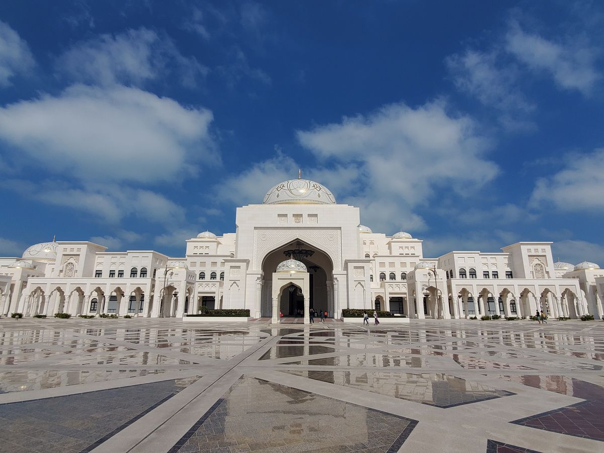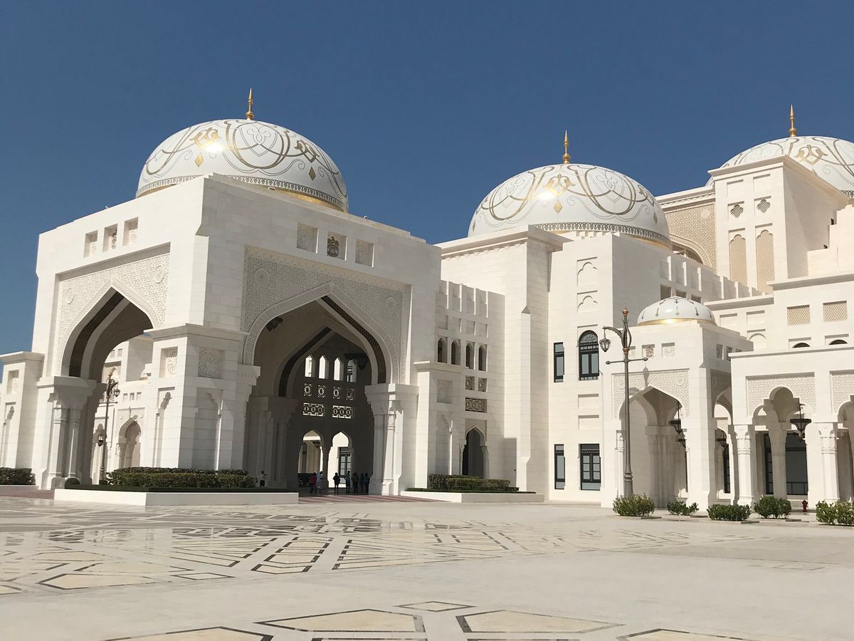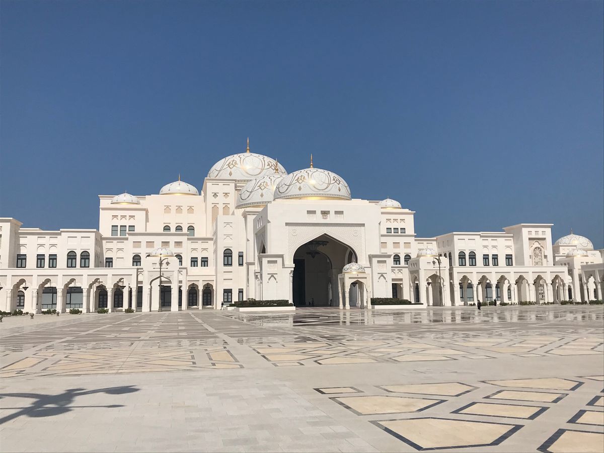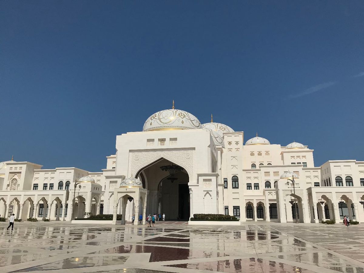 グランドモスクが一番の目的でしたが、午前中のカスールアルワタンでも度肝を抜く豪華さにため息出まくりでした。エントランスの前から見た宮殿は本当に美しく、青空に映えて最高にきれいでした。