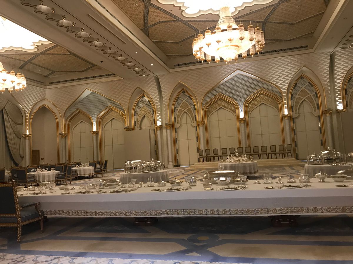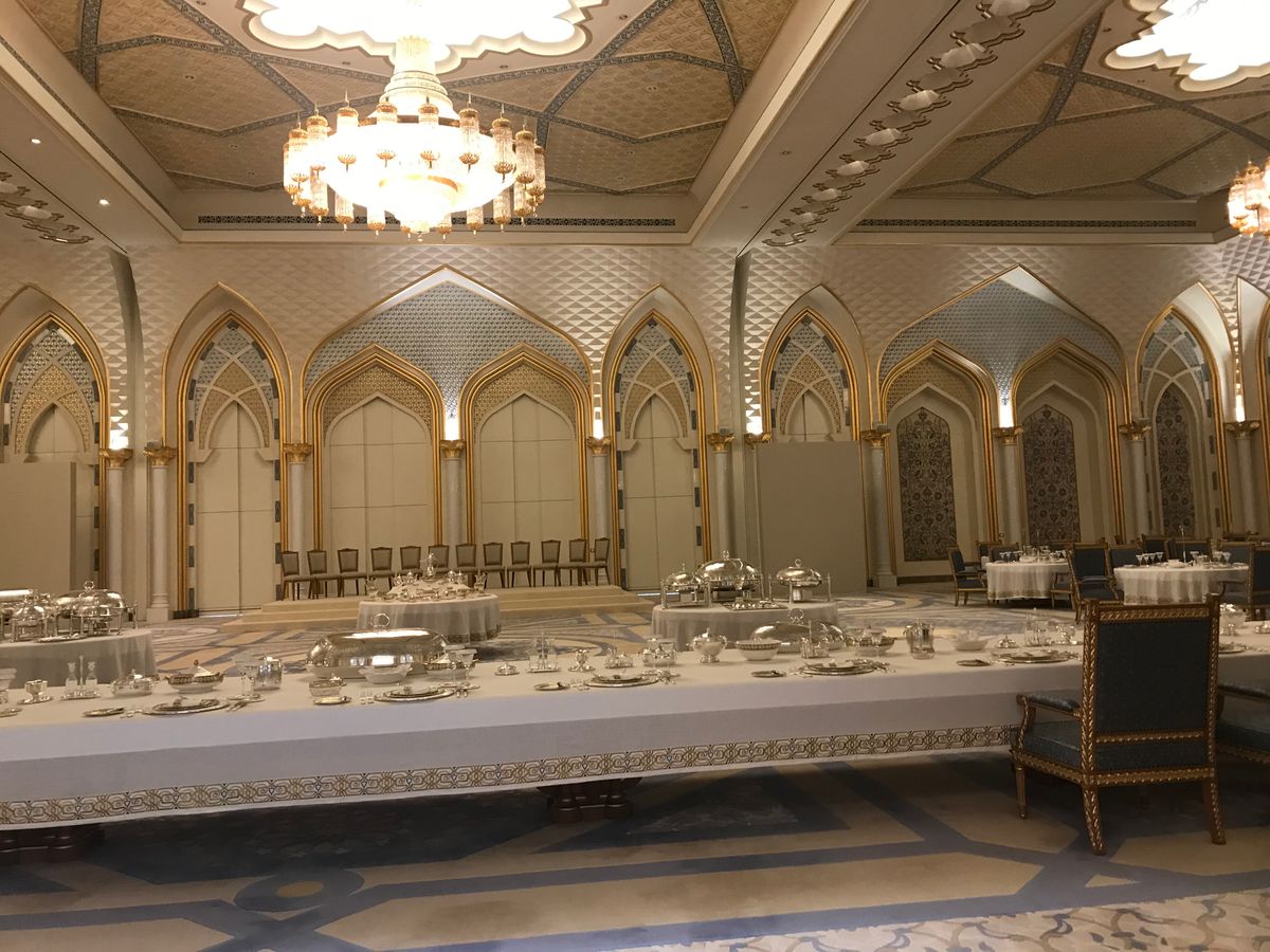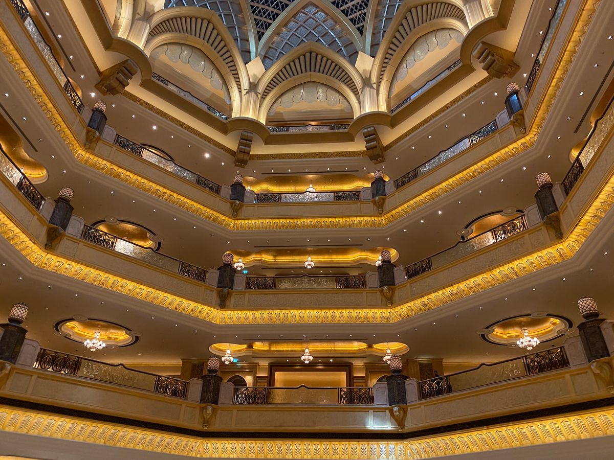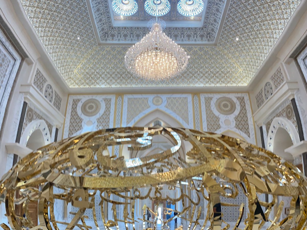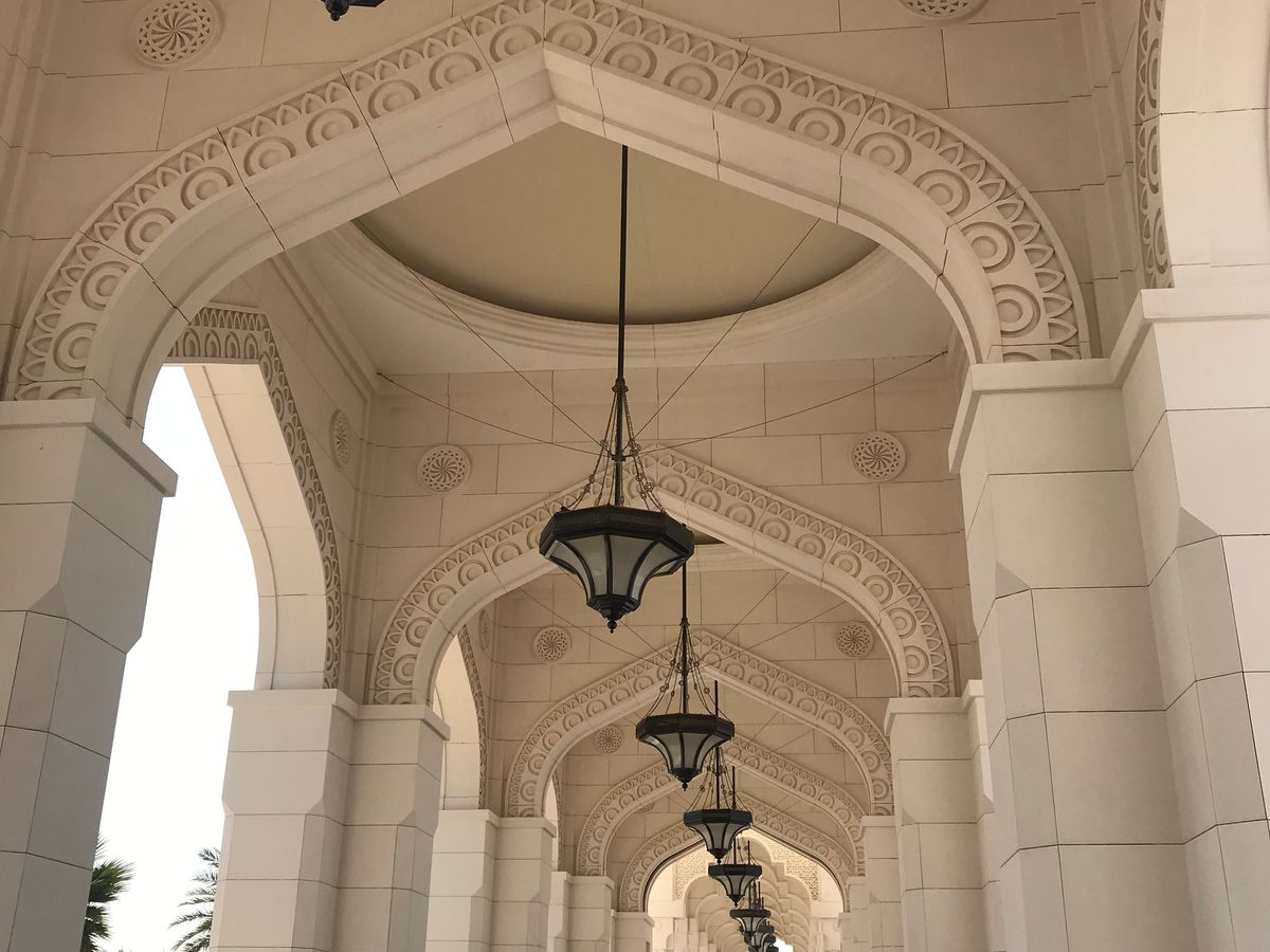 グランドモスクが一番の目的でしたが、午前中のカスールアルワタンでも度肝を抜く豪華さにため息出まくりでした。エントランスの前から見た宮殿は本当に美しく、青空に映えて最高にきれいでした。